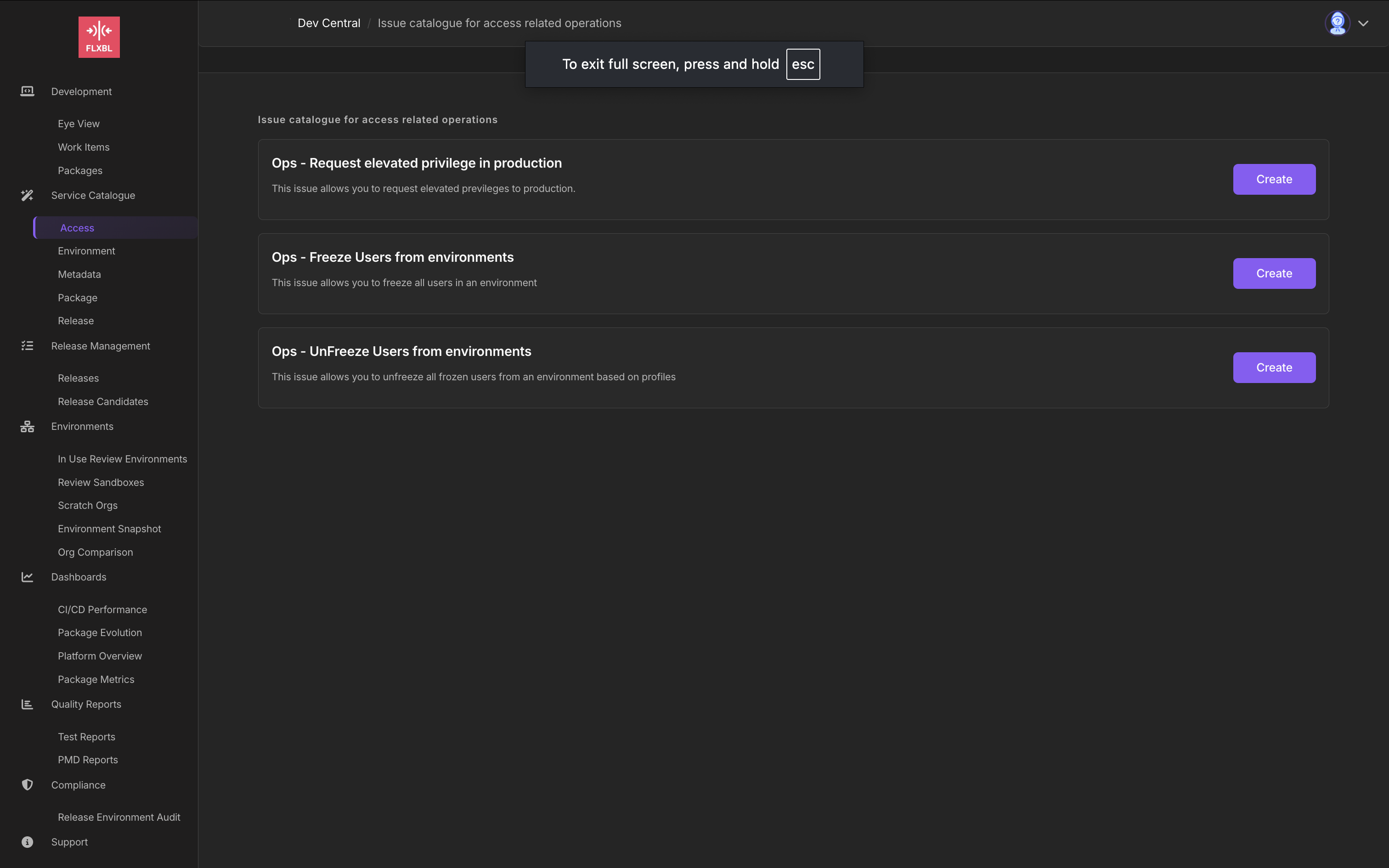 Dev Central is your single-pane-of-glass control center, providing complete visibility across work items, pull requests, environments, and releases. Developers can monitor builds, track deployments, view metrics, and raise operational requests—all from one unified GitHub Pages application.