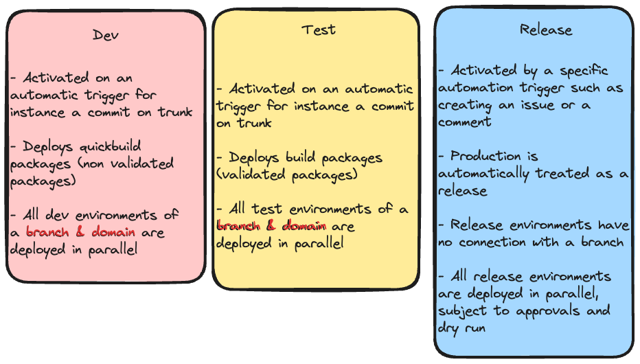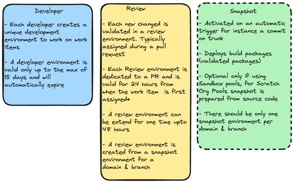 sfops follow the environment strategy as mentioned in the 'flxbl' framework. You can read more details [here](https://app.gitbook.com/s/81CMYlxTEobShX3WGZxY/techniques/environment-management). To recap the environments used in sfops, please see the categories below