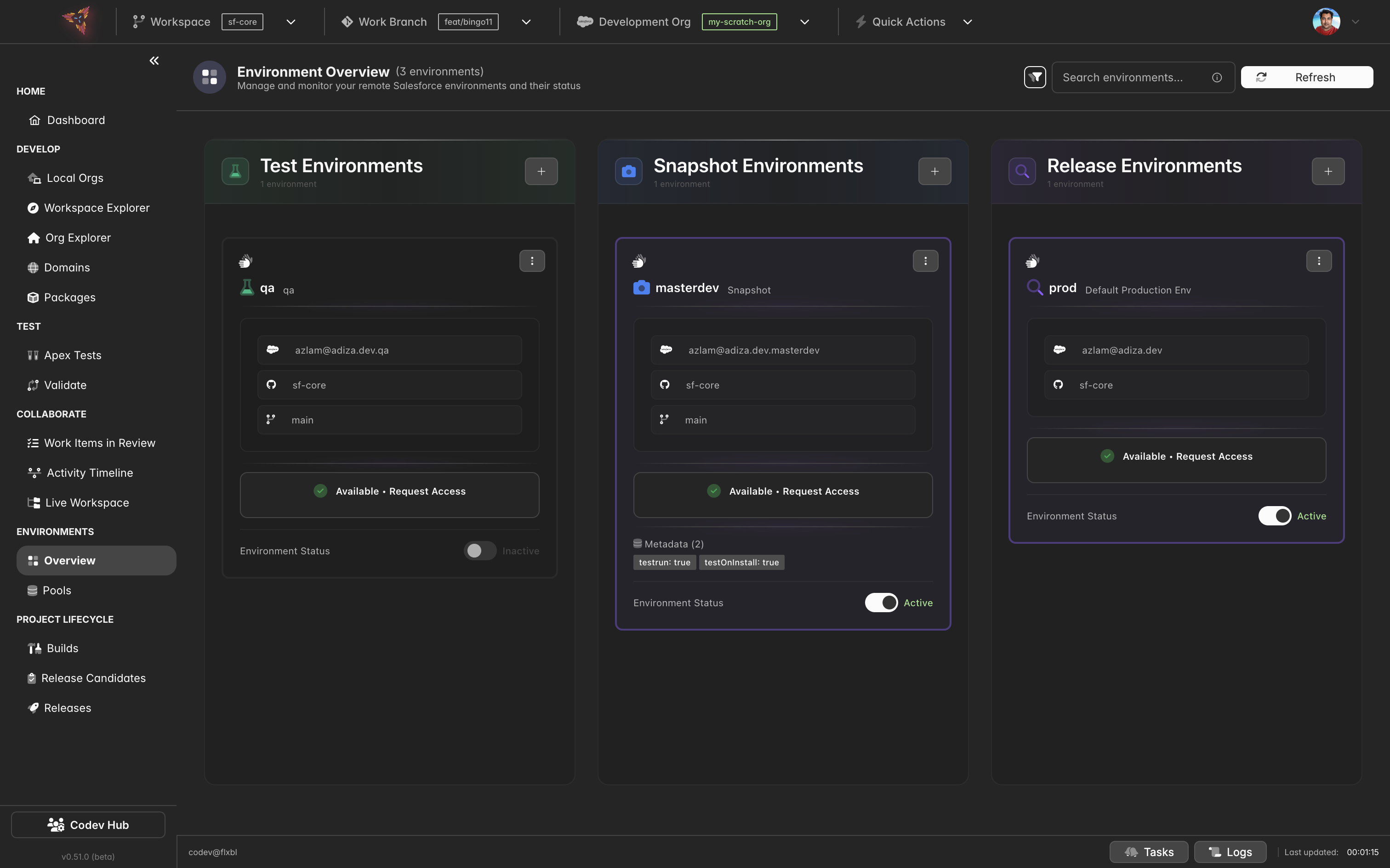 This section details on how environments are operated in the context of sfops. An environment is backed by a Salesforce sandbox and few additional metadata. An environment can be created or deleted dynamically and can be associated with a stage in the pipeline such as 'development', 'test' or 'release'