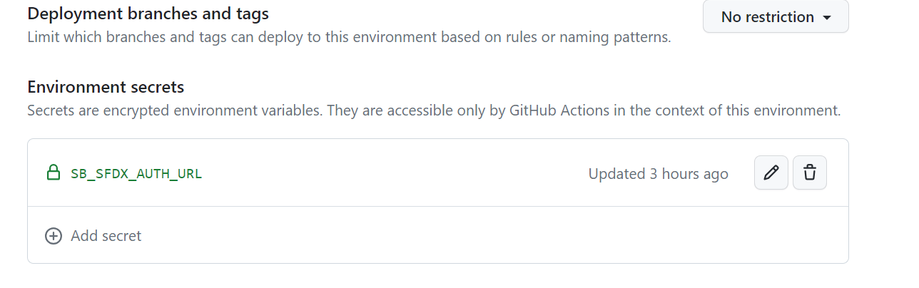 Sandboxes created by the DevHub user (the CI/CD user authenticated via DEVHUB\_SFDX\_AUTH\_URL) can be authenticated automatically using the sandbox name configured above. No additional secrets are required.