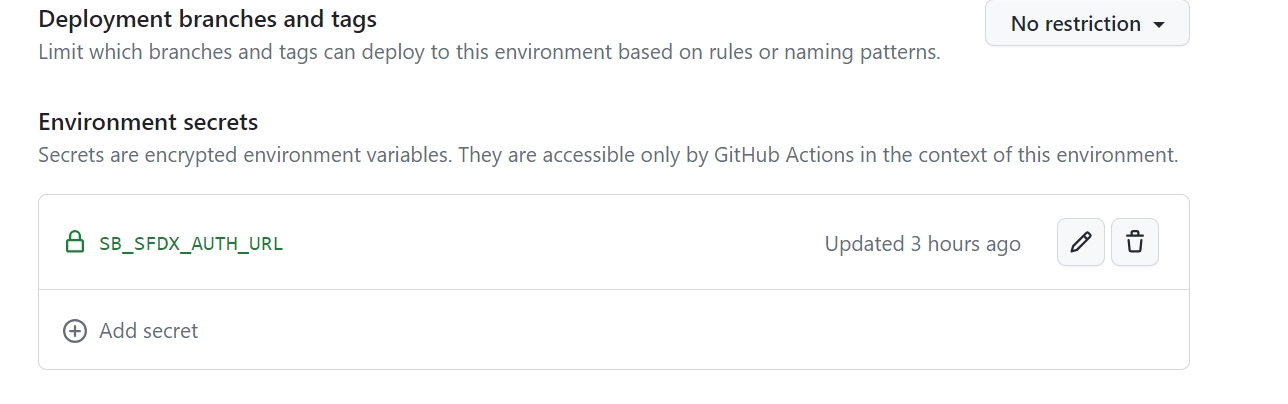 Sandboxes created by the DevHub user (the CI/CD user authenticated via DEVHUB_SFDX_AUTH_URL) can be authenticated automatically using the sandbox name configured above. No additional secrets are required.
