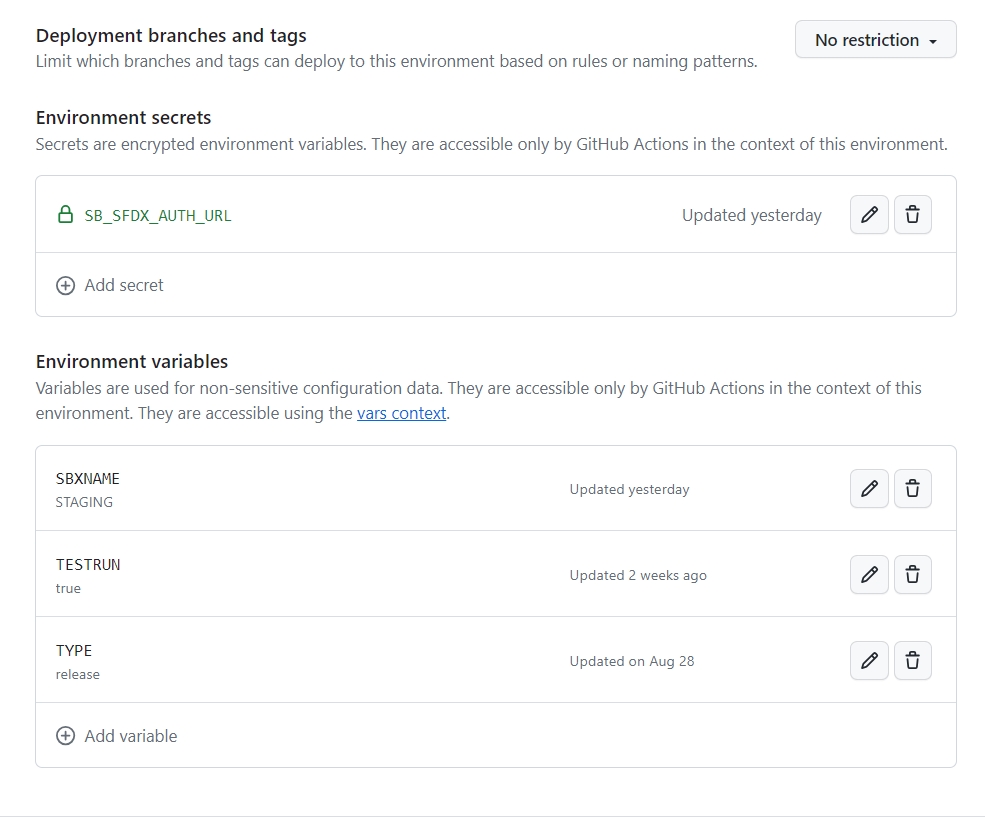 Environments in sfops is tied to GitHub Environments (https://docs.github.com/en/actions/deployment/targeting-different-environments/using-environments-for-deployment) with additional metadata such as described below