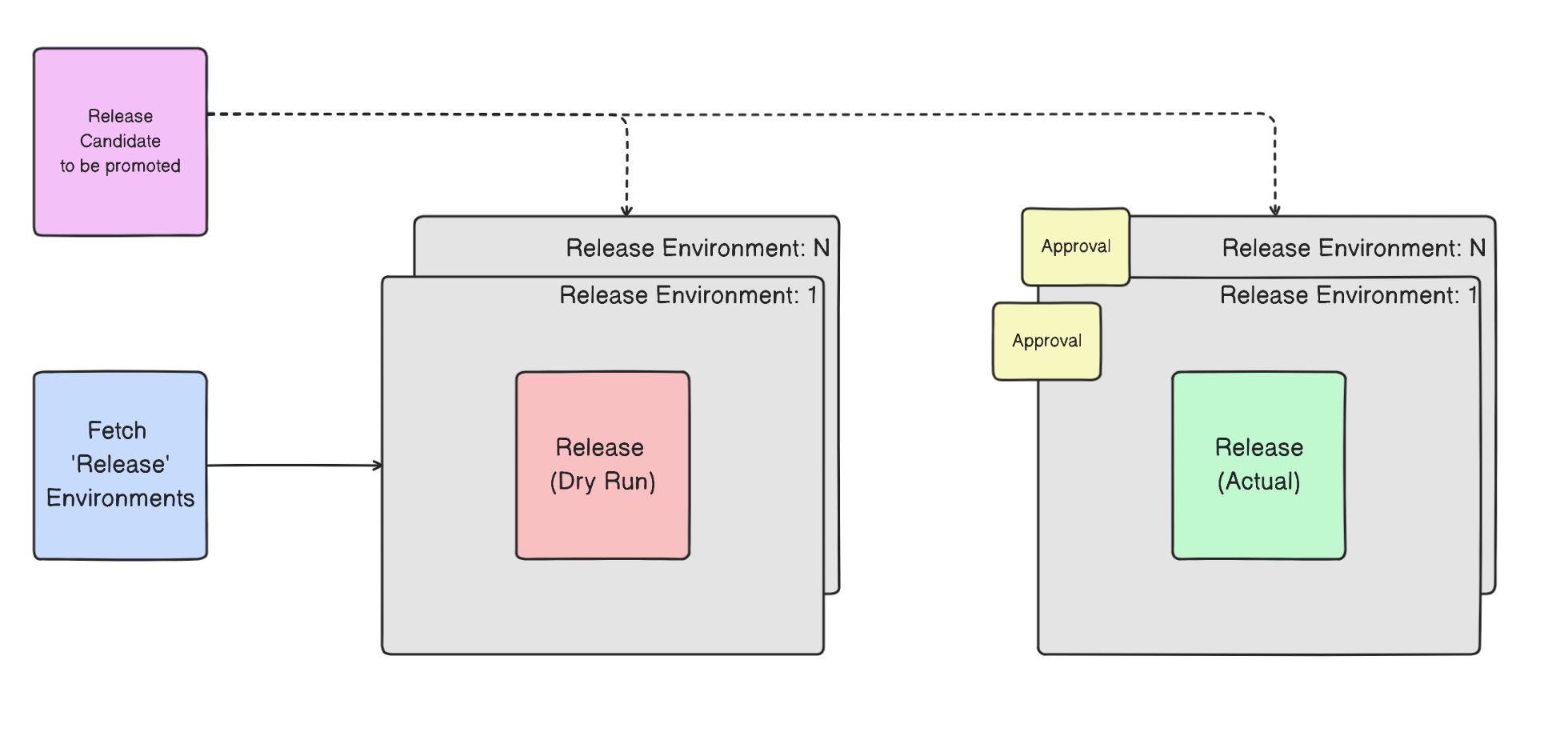 The release environments typically is configured with "Required Reviewers" (<https://docs.github.com/en/actions/deployment/targeting-different-environments/using-environments-for-deployment#required-reviewers>) and would need the respective environment owners to approve a release. Please note required reviewers are not required for the pre-release/ dry run check