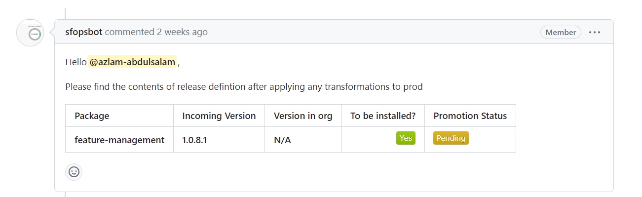 This workflow then proceeds to fetch all the environments that are marked with "type:release" and proceeds to execute a dry run of the command in parallel across all release environments. The output of the dry run will be available as a comment in the Github issue created. The team could have a final check on the deployment plan that will be executed by sfops before proceeding for the actual execution.