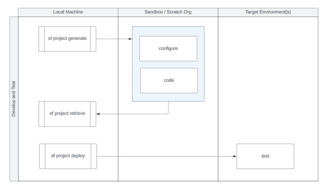 From a build, test, and deployment perspective, the following diagram depicts the bare minimum commands necessary to get up and running in setting up your sf project, retrieving and deploying code to the target environments.