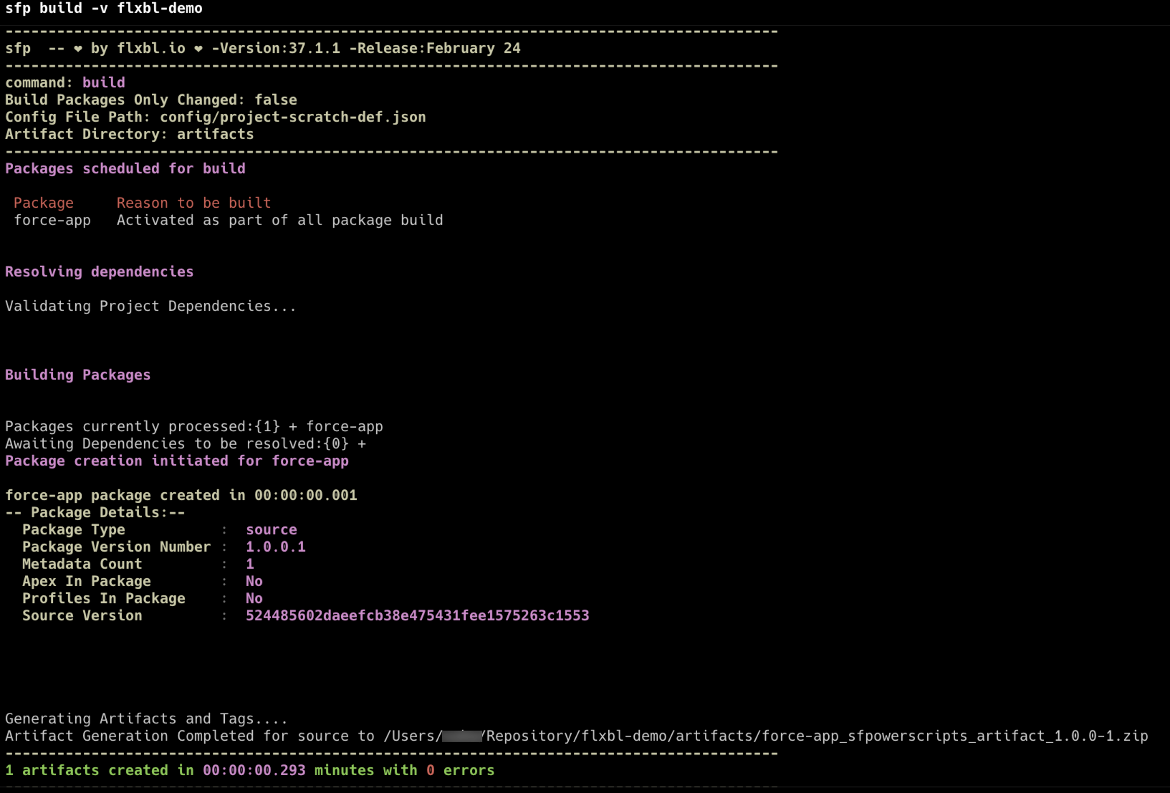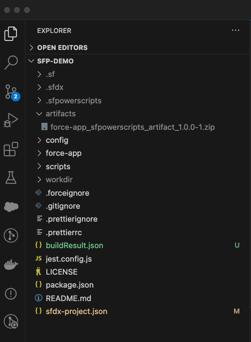 A new "artifacts" folder will be generated within your source project containing a zipped artifact file for each package defined in your sfdx-project.json file. For example, the artifact files will contain the following naming convention with the "_sfpowerscript_artifact_" in between the package name and version number.