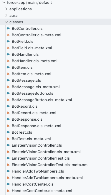 Typically, version control repository for Salesforce is organized by components classified by each metadata type. For example, the following image shows all the apex classes in the org are placed under the 'classes' directory.